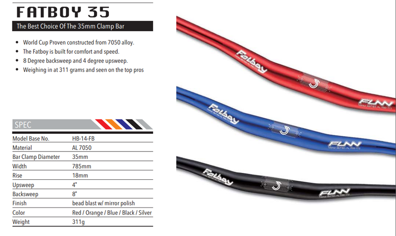 FUNN FATBOY燕把,2015款,35MM口徑,785MM寬,18MM抬升,7050三抽車把,超輕,超強度,易操控,AM DH的首選,DH世界冠軍的選擇!有黑色,紅色,藍色和橘色,原裝臺灣生產(chǎn)。