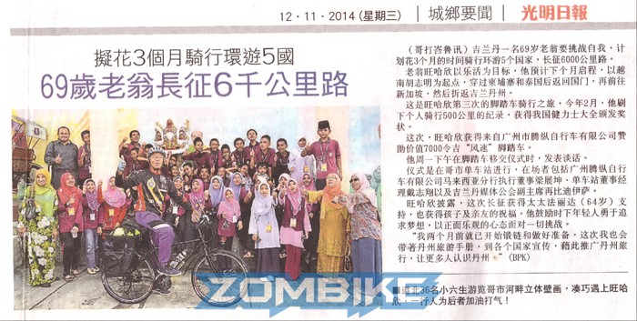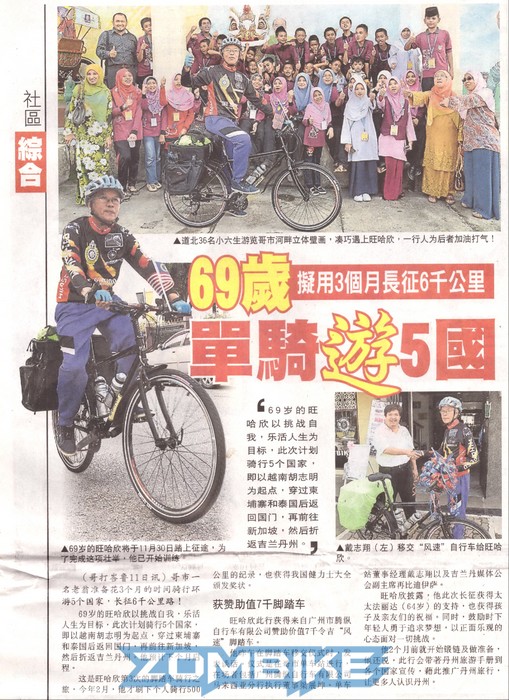 69歲馬來西亞單車騎士旺哈欣以挑戰(zhàn)自我、樂活人生為目標(biāo),計(jì)劃在3個(gè)月內(nèi)騎自行車游5國(guó),以證明自己老當(dāng)益壯,不枉此生。
