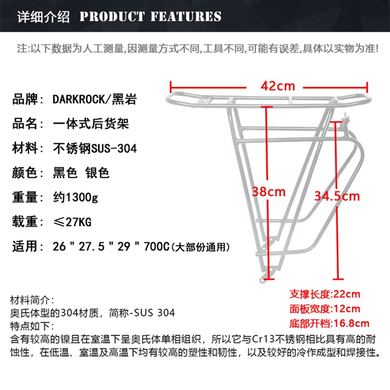 DARKROCK 不銹鋼貨架DARKROCK 不銹鋼貨架,黑色,碟剎/V剎通用,26/27.5/29大部份通用。重量1300g,限重27KG。