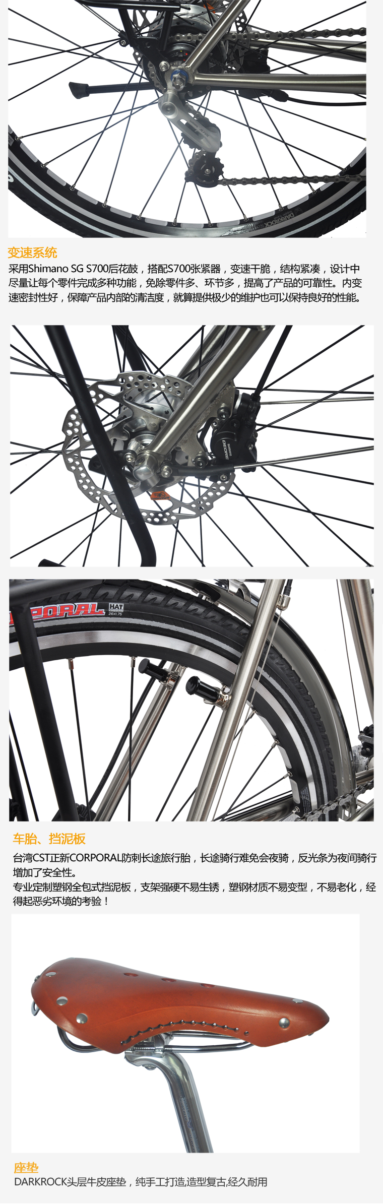 DARKROCK pioneers 內(nèi)11速長途旅行車,26寸,車架有M、L可選,shimano內(nèi)11速套件,純手工頭層牛皮坐墊,前發(fā)電花鼓。