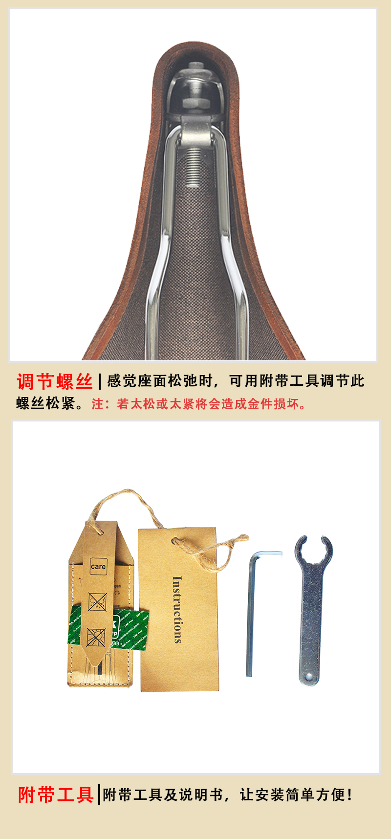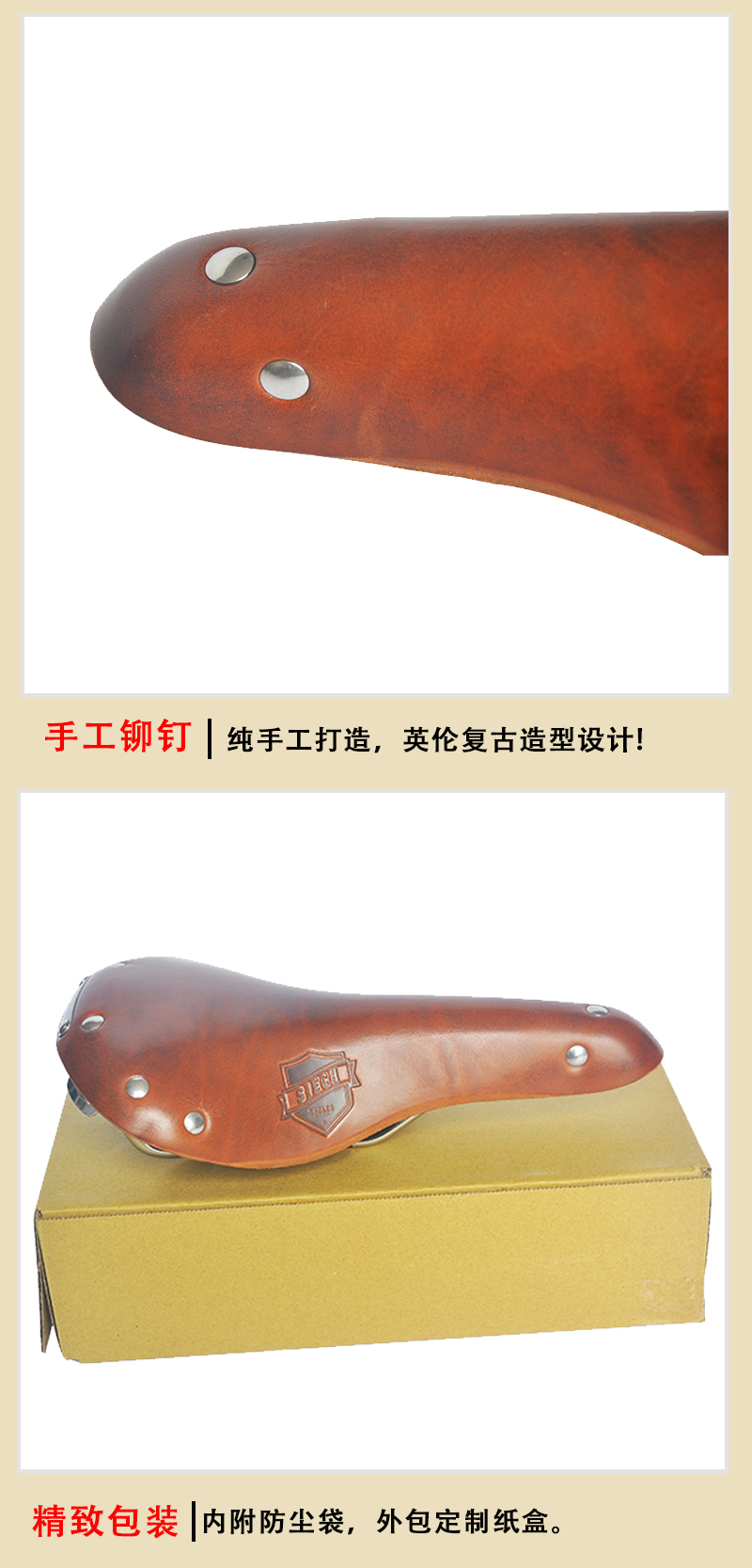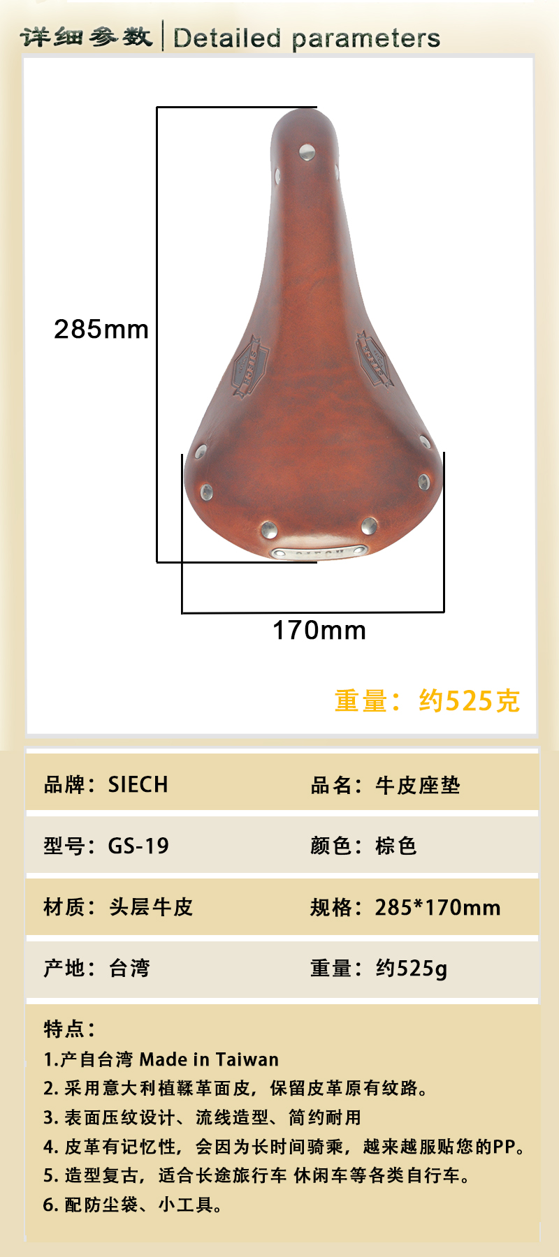 歐洲品牌SEICH牛皮坐墊長途旅行車休閑復古自行車座墊 臺灣Gyes巨業GS-19牛皮坐墊 規格:長285mm, 寬170mm 重量約525g 材質:進口牛皮 / 鋼軌 配有防塵袋1個 / 小工具2個 深棕色 臺灣巨業代工 全新正品