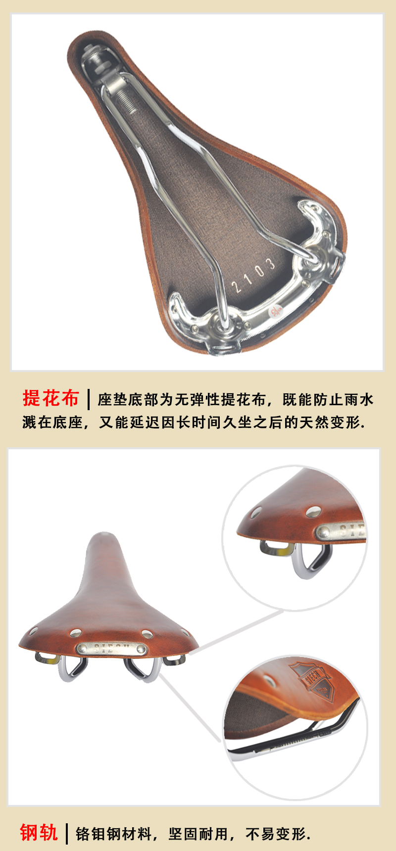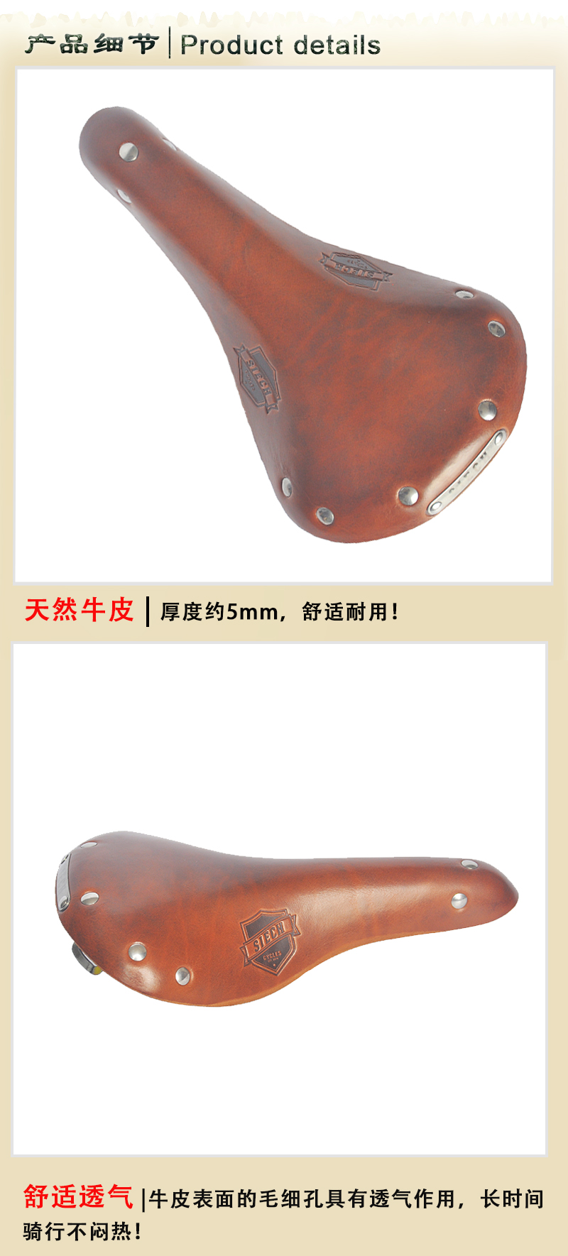 SIECH頭層牛皮座墊(棕色)洲品牌SIECH牛皮坐墊長途旅行車休閑復古自行車座墊 棕色