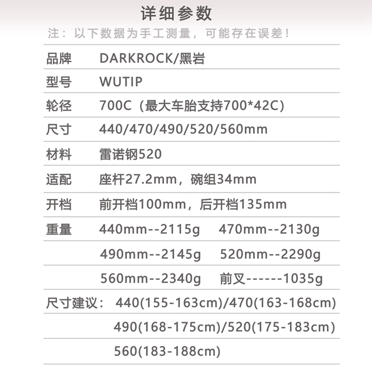 重量:560MM--2340g 520mm---2290g 490mm--2145g 470mm--2130g 440mm--2115g 前叉重量1035克